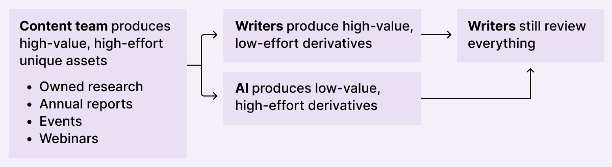 Teams forced to do more should not be spending time on formulaic, time-consuming tasks where each output is low value—like blog articles. You need those assets in aggregate, and you need them fast.