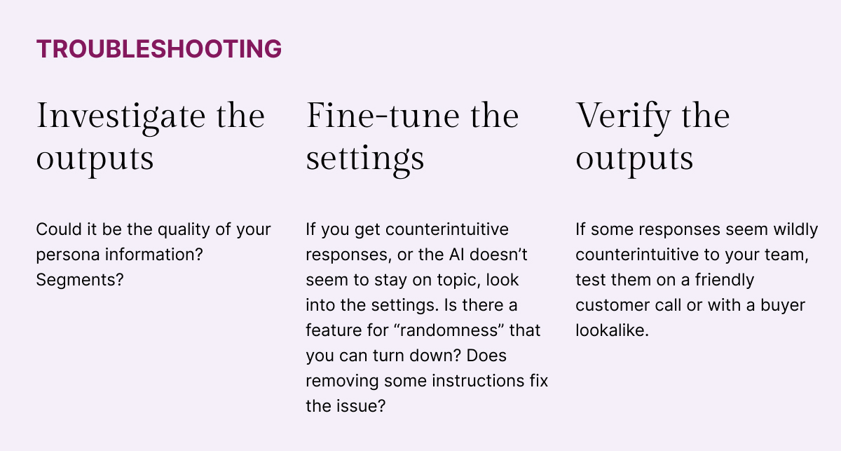 Use the resulting feedback to end those interminable cycles of everyone feeling “the copy isn’t quite there.” In truth, everyone internally may not know. They haven’t talked to enough customers lately and committees are an awful way to make content decisions. A synthetic persona can give every person a lookalike editor to arrive at stronger copy on the first pass.